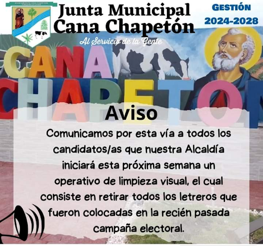 Cana Chapetón, Guayubín, Monte Cristi. – La Alcaldesa de la Junta Municipal de Cana Chapetón emitió a finales de mayo un comunicado oficial para informar a la comunidad sobre el inicio de una campaña para retirar todos los letreros de publicidad política que se encuentran en las calles del Distrito Municipal.