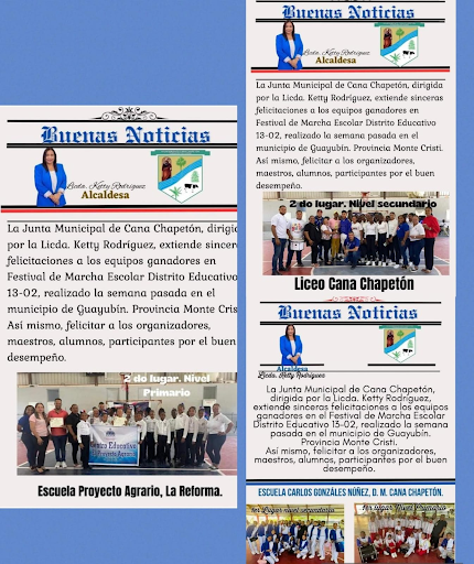 Cana Chapetón, Guayubín, Monte Cristi. – La Alcaldesa de la Junta Municipal de Cana Chapetón y su equipo de trabajo expresaron sinceras felicitaciones a los estudiantes de la Escuela Carlos Gonzáles Núñez, Liceo de Cana Chapetón y Escuela Proyecto Agrario, por haber obtenido el primer y segundo lugar en el prestigioso Festival de Marcha celebrado recientemente en el municipio de Guayubín.