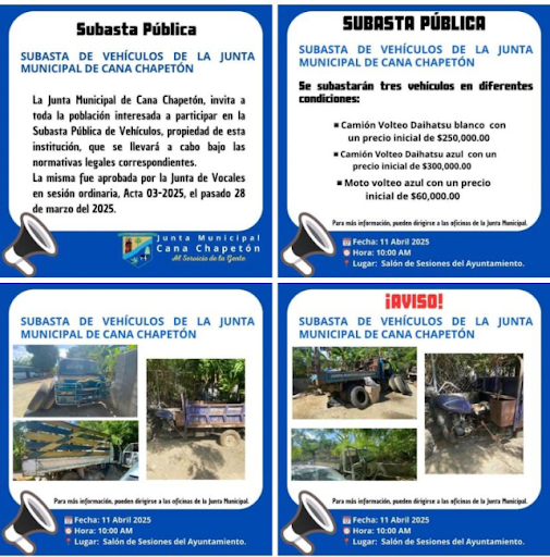 Cana Chapetón, Guayubín, Montecristi. – La Junta Municipal de Cana Chapetón, dirigida por la Licda. Ketty Rodríguez, anunció la realización de una subasta pública de vehículos, como parte de su proceso de reorganización administrativa y disposición de bienes en desuso. La actividad está abierta a toda la ciudadanía interesada en participar de manera transparente y conforme a las disposiciones legales vigentes.